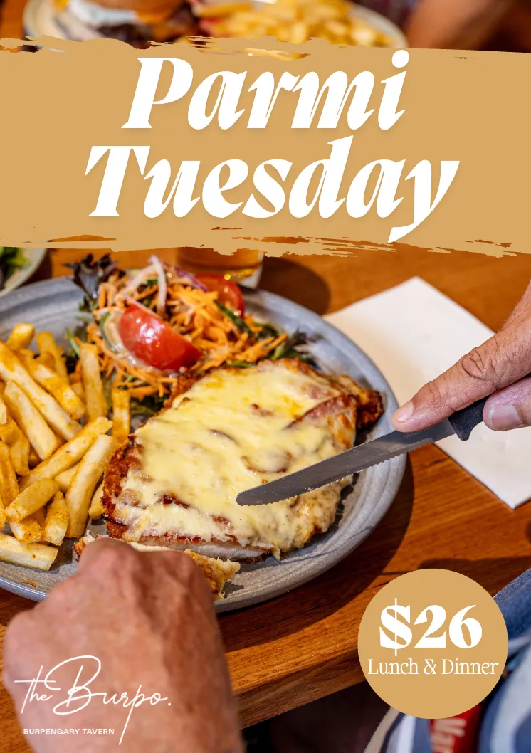 Choice of any Parmi from our menu for $26 lunch and dinner.
