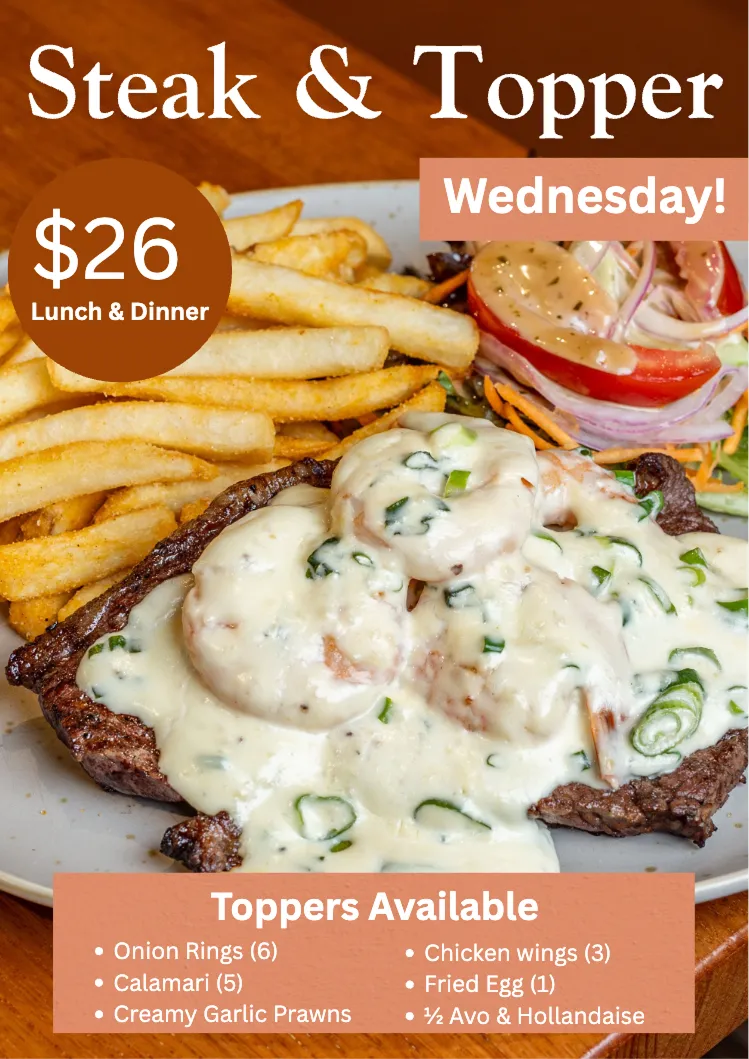 200g Riverina black angus steak with choice of topper with chips, salad and choice of sauce $26 lunch and dinner.